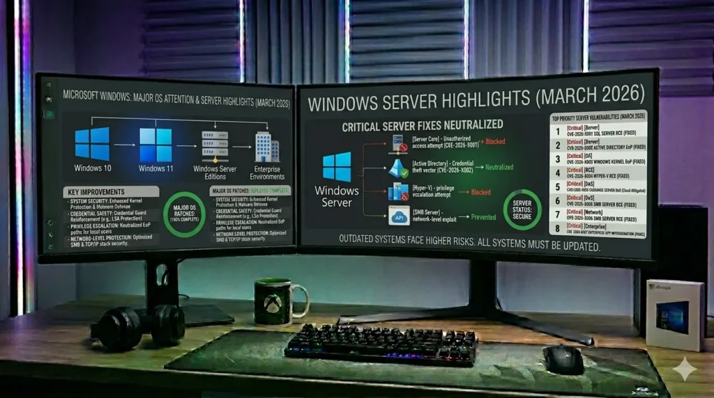 Another key improvement involved privilege escalation vulnerabilities. These flaws allow attackers with limited access to gain higher-level administrator permissions. Once attackers gain admin access, they can control systems, disable security tools, and steal important files. Microsoft’s March 2026 patches closed several of these dangerous pathways, reducing major risks for both home and office users.